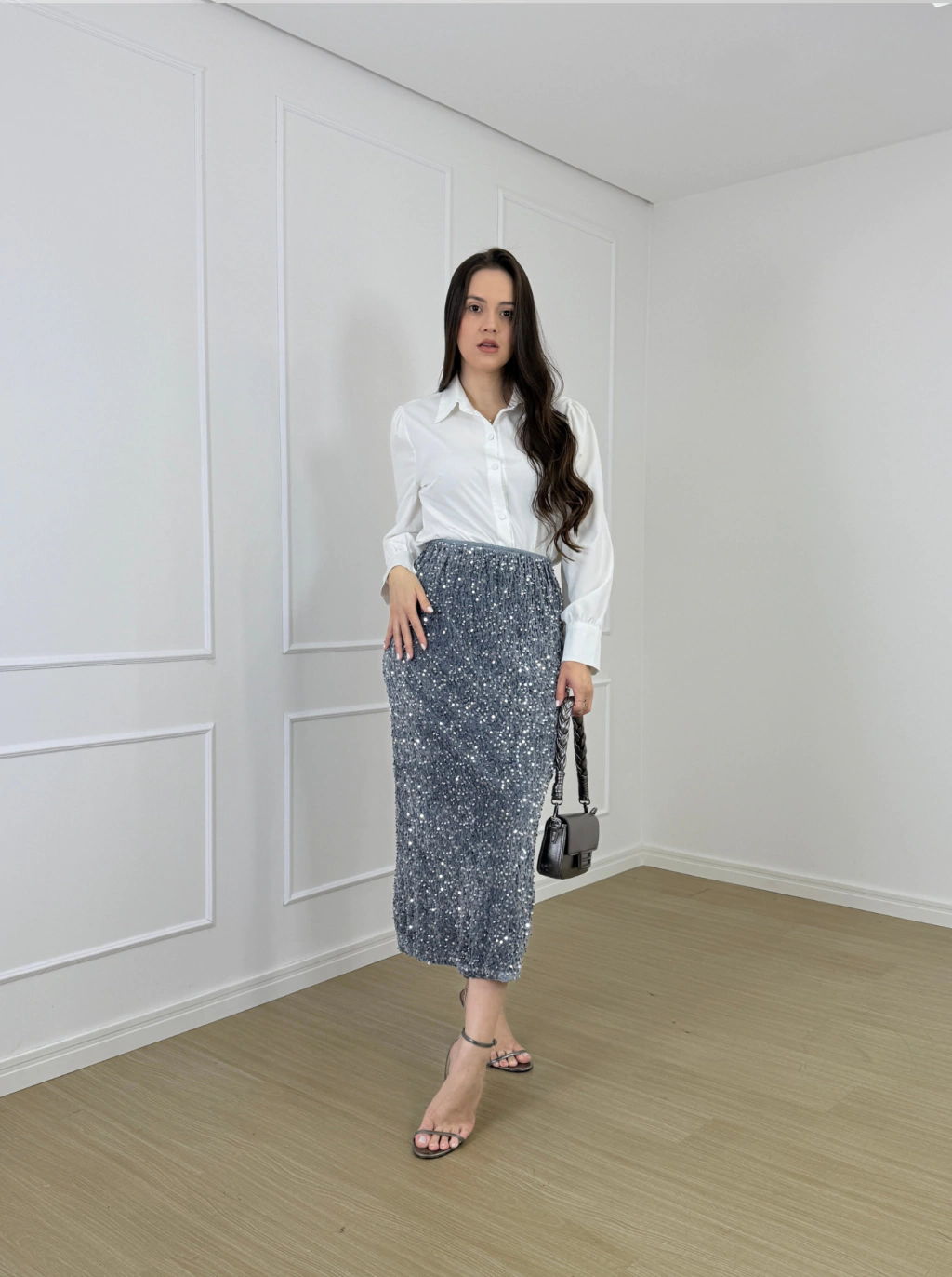Seja o centro das atenções com a Saia Midi Paetê Karoline, que une brilho, conforto e um design pensado para você brilhar em qualquer ocasião especial.