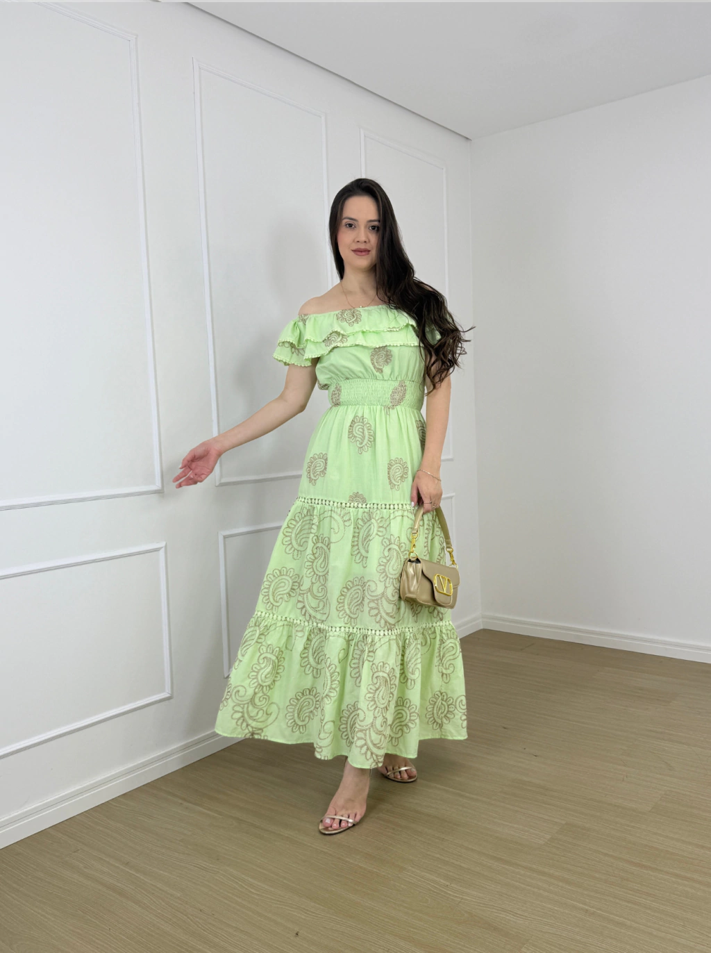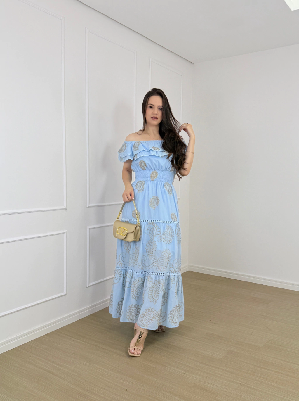 Confeccionado em tecido tricoline de alta qualidade, este vestido longo apresenta um design delicado com bordado em lurex que adiciona brilho sutil à peça. Seu diferencial está na opção de usar ombro a ombro ou de forma tradicional, oferecendo versatilidade no estilo.